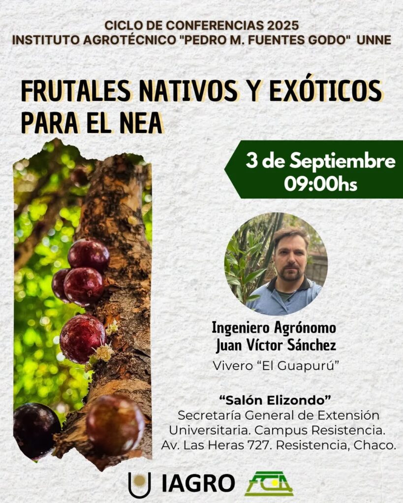 3 septiembre, 2025 @ 9:00 am – Nos complace invitarlos a la conferencia «Frutales Nativos y Exóticos para el NEA» El día 03 de septiembre a las 09:00 am en el Salón Elizondo de la Secretaría General de Extensión Universitaria, Campus Resistencia (Av. Las Heras 727, Resistencia, Chaco). Disertante: Ing. Agr. Juan Víctor Sánchez del Vivero «El Guapurú» Corrientes Capital. Formulario de […]