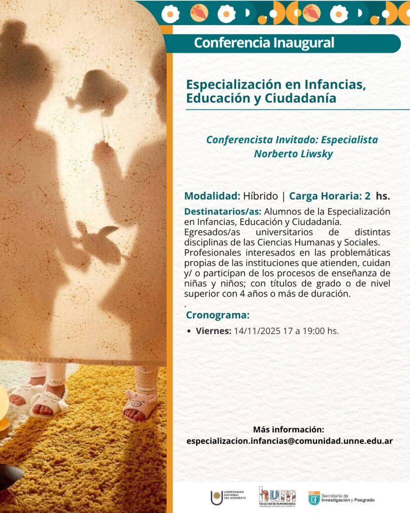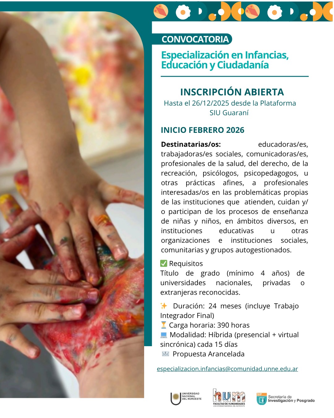 La Universidad Nacional del Nordeste invita a participar de la Convocatoria Abierta y la Conferencia Inaugural de la Especialización en Infancias, Educación y Ciudadanía.