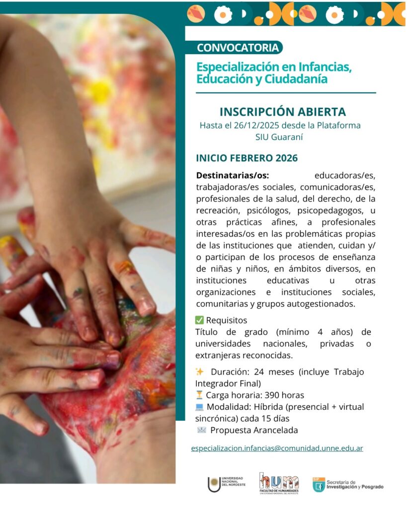 Se invita a toda la comunidad universitaria y al público interesado a participar y difundir esta propuesta, que marca el inicio de una nueva oferta de posgrado orientada a fortalecer la formación y el debate en torno a las infancias, la educación y la ciudadanía.