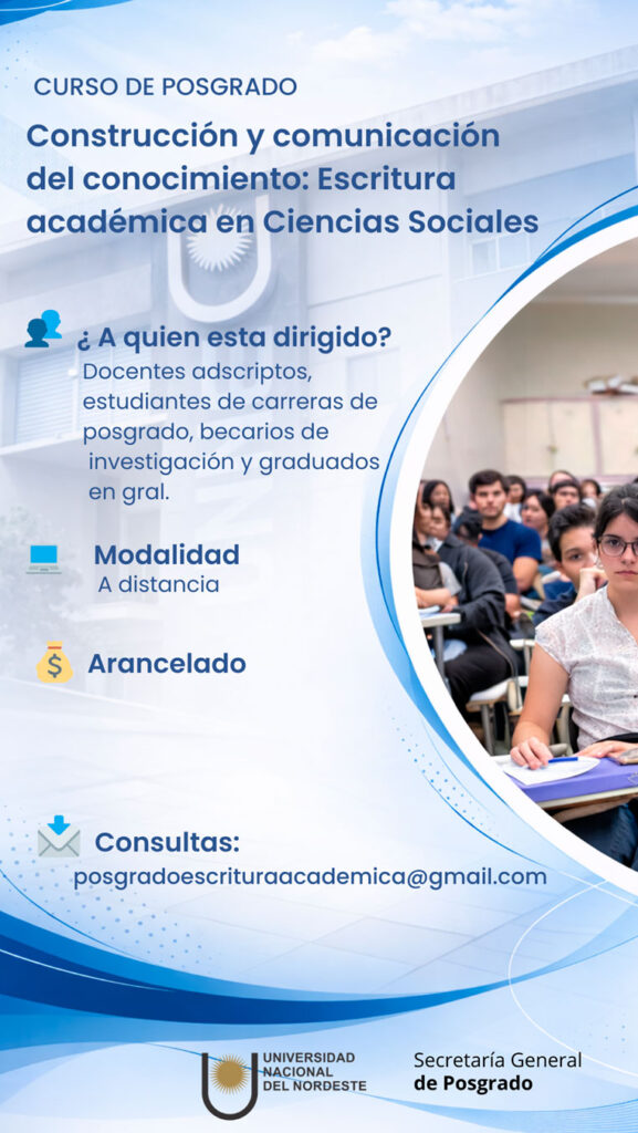 La Universidad Nacional del Nordeste a través de la Secretaría General de Posgrado y en el marco del Programa de Posdoctorado, informa la apertura de inscripciones al Curso de Posgrado “Construcción y Comunicación del Conocimiento: Escritura Académica en Ciencias Sociales”, aprobado por Resolución del Consejo Superior N.º 715/2025.
