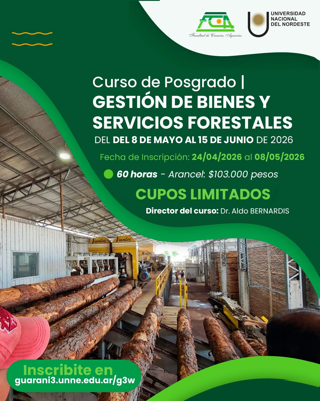 Se encuentra abierta la inscripción a nuestro próximo Curso de posgrado sobre Gestión de Bienes y Servicios Forestales. El curso otorga 4 créditos, comprende clases virtuales y presenciales, y dará inicio el 8 de mayo.