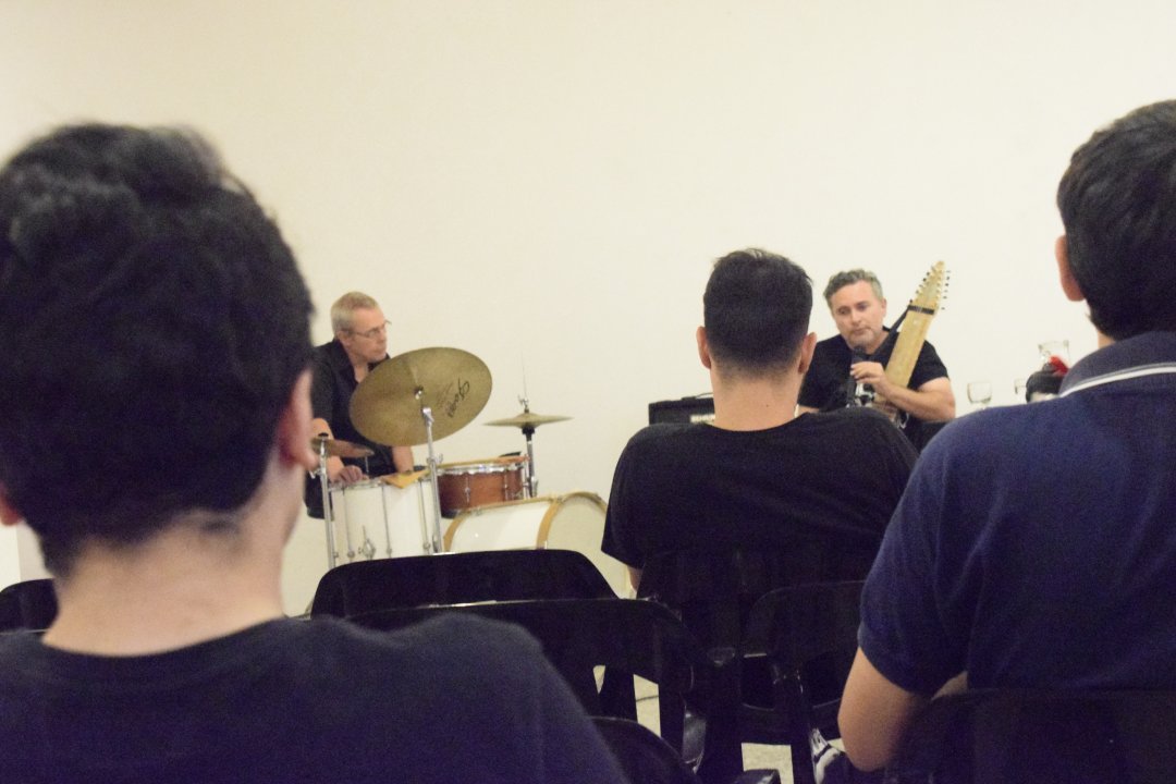 La atención del público sigue creciendo. Las palabras de los profesores gobierna el espacio. El susurro del aire acondicionado quiebra los silencios. Osvaldo tomó el stick y explicó cuestiones técnicas sobre como hace música. Dio ejemplos y los comparaba con el bajo o con los bajos del acordeón.